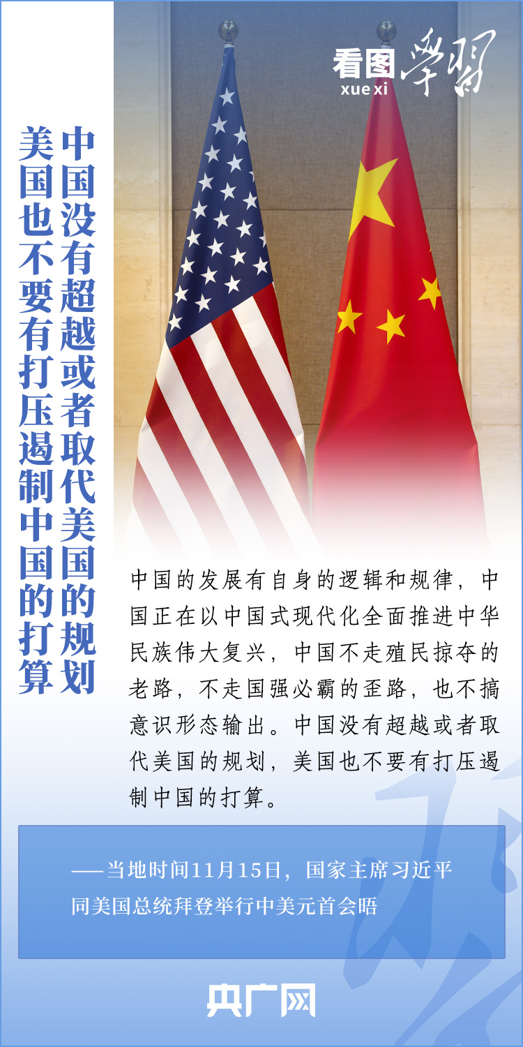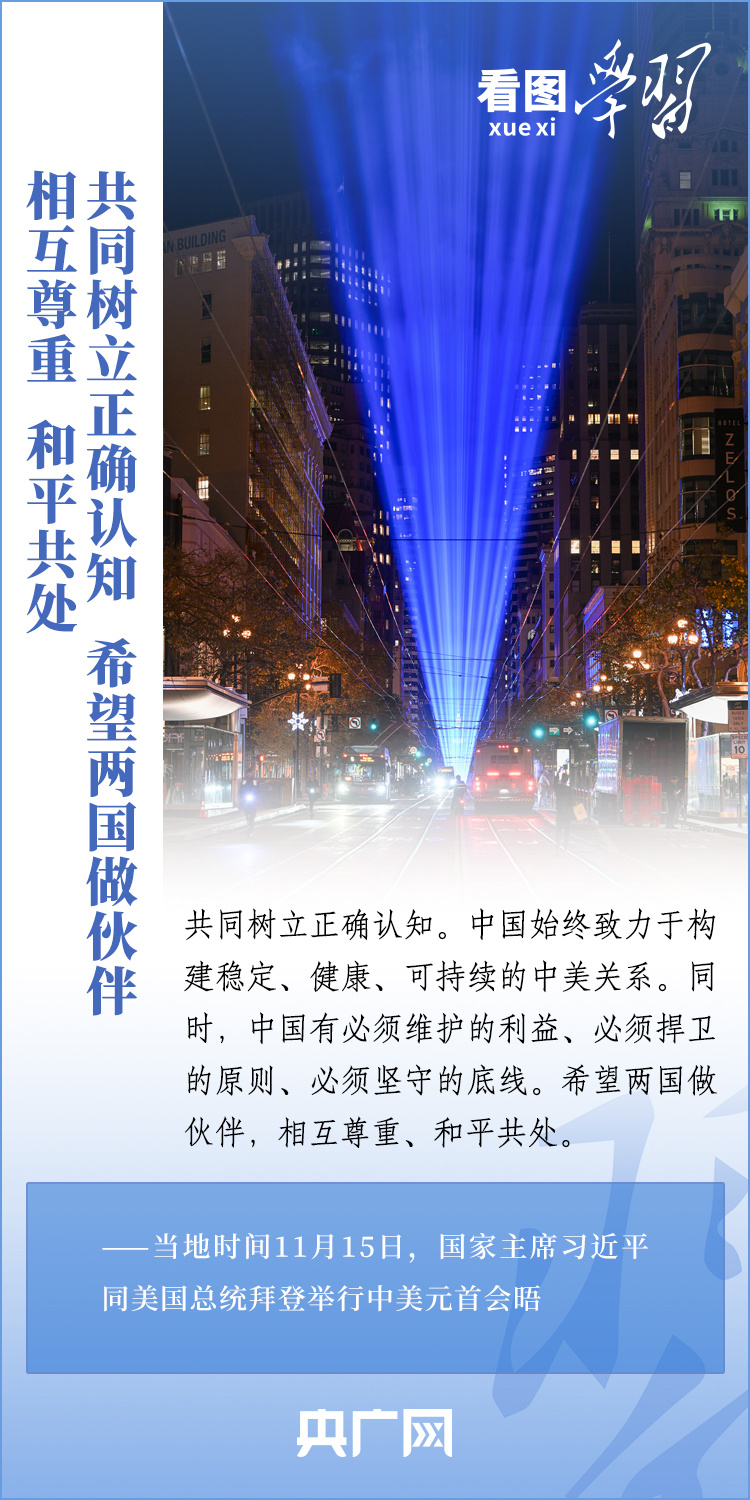 當(dāng)?shù)貢r(shí)間11月15日,國(guó)家主席習(xí)近平在美國(guó)舊金山斐洛里莊園同美國(guó)總統(tǒng)拜登舉行中美元首會(huì)晤。兩國(guó)元首就事關(guān)中美關(guān)系的戰(zhàn)略性、全局性、方向性問(wèn)題以及事關(guān)世界和平和發(fā)展的重大問(wèn)題坦誠(chéng)深入地交換了意見(jiàn)。習(xí)近平主席指出,大國(guó)競(jìng)爭(zhēng)解決不了中美兩國(guó)和世界面臨的問(wèn)題。這個(gè)地球容得下中美兩國(guó)。中美各自的成功是彼此的機(jī)遇。一起來(lái)學(xué)習(xí)!