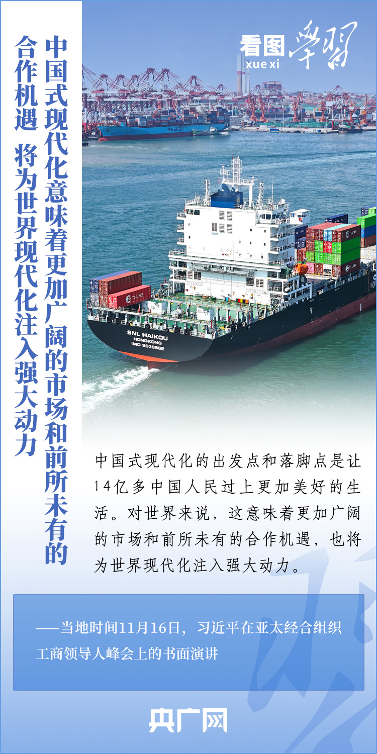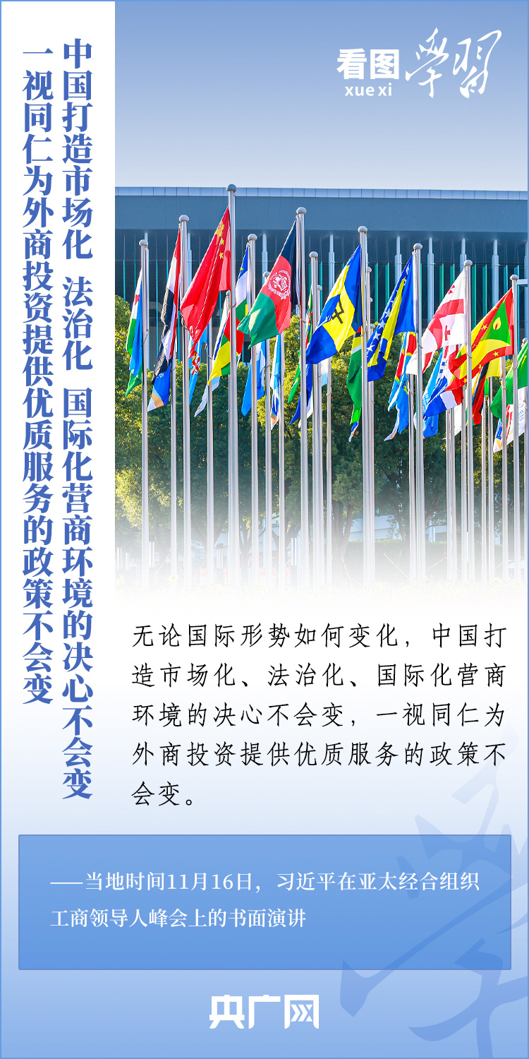 當?shù)貢r間11月16日,國家主席習近平應邀出席亞太經(jīng)合組織工商領導人峰會并發(fā)表書面演講。習主席深刻總結了亞太經(jīng)濟合作30年來非凡成就和啟示,對亞太合作下一個30年將走向何方這一新的時代之問提出中國答案,重申“中國打造市場化、法治化、國際化營商環(huán)境的決心不會變,一視同仁為外商投資提供優(yōu)質服務的政策不會變”,向全球工商界發(fā)出邀請,歡迎“積極參與中國式現(xiàn)代化進程,共享中國高質量發(fā)展帶來的巨大機遇!”一起來學習。