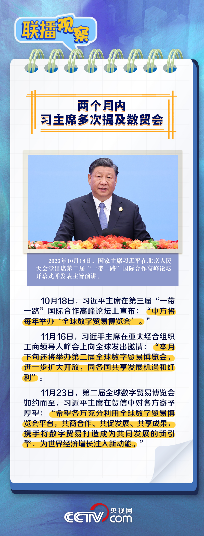 聯(lián)播+“當(dāng)前,全球數(shù)字貿(mào)易蓬勃發(fā)展,成為國(guó)際貿(mào)易的新亮點(diǎn)?!?1月23日,習(xí)近平主席向第二屆全球數(shù)字貿(mào)易博覽會(huì)致賀信,回顧了近年來中國(guó)為全球數(shù)字貿(mào)易蓬勃發(fā)展付出的努力,并對(duì)與會(huì)各方寄予厚望。