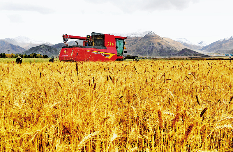 近年來,西藏自治區(qū)積極實施耕地改造,通過開展高標準農(nóng)田建設,全方位提升耕地質(zhì)量與糧食產(chǎn)量,夯實糧食安全基礎。圖為工作人員駕駛農(nóng)業(yè)機械在拉薩市林周縣曲果強村的高標準農(nóng)田里收獲小麥(2023年10月12日攝)。 新華社記者 張汝鋒/攝