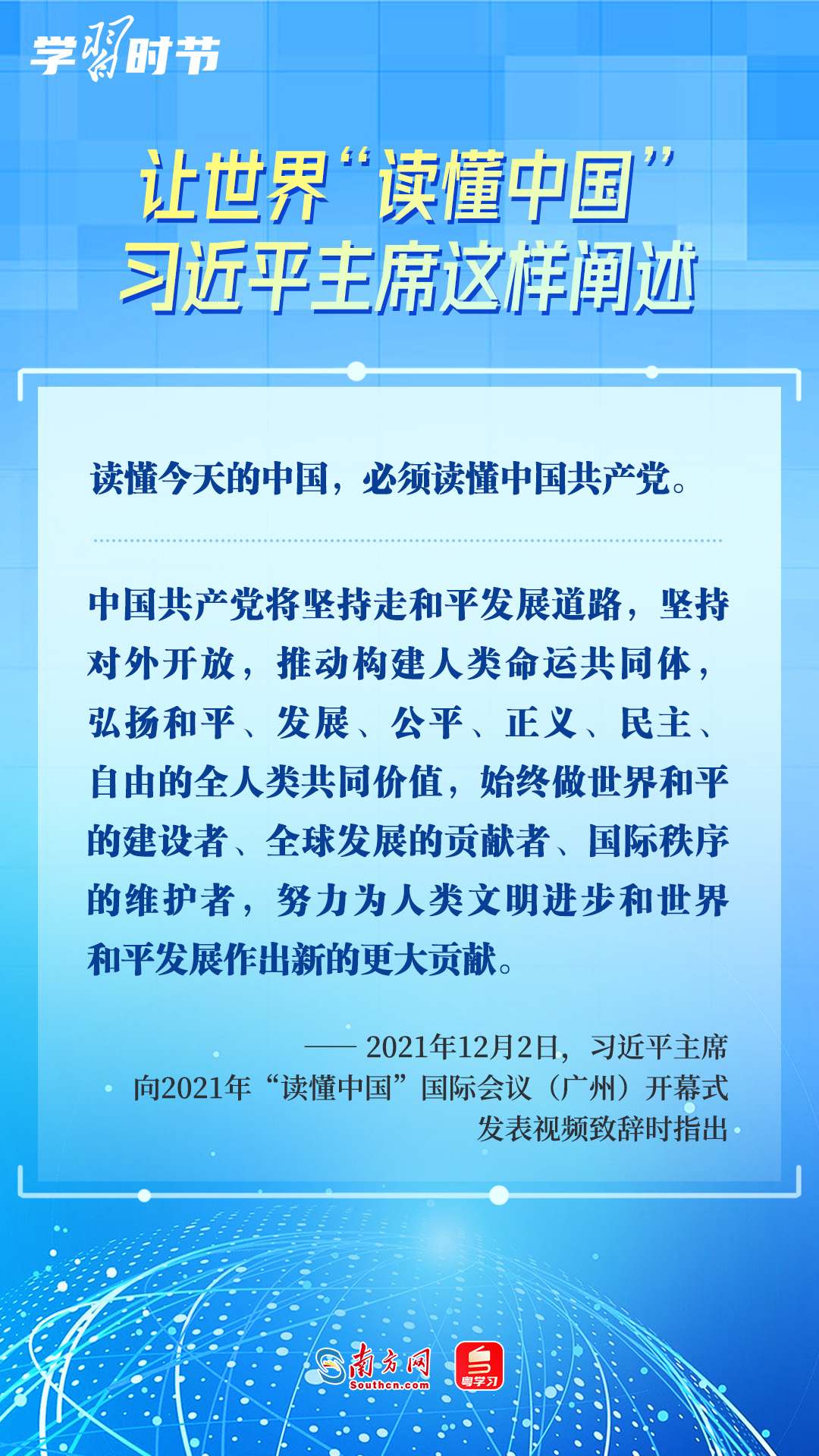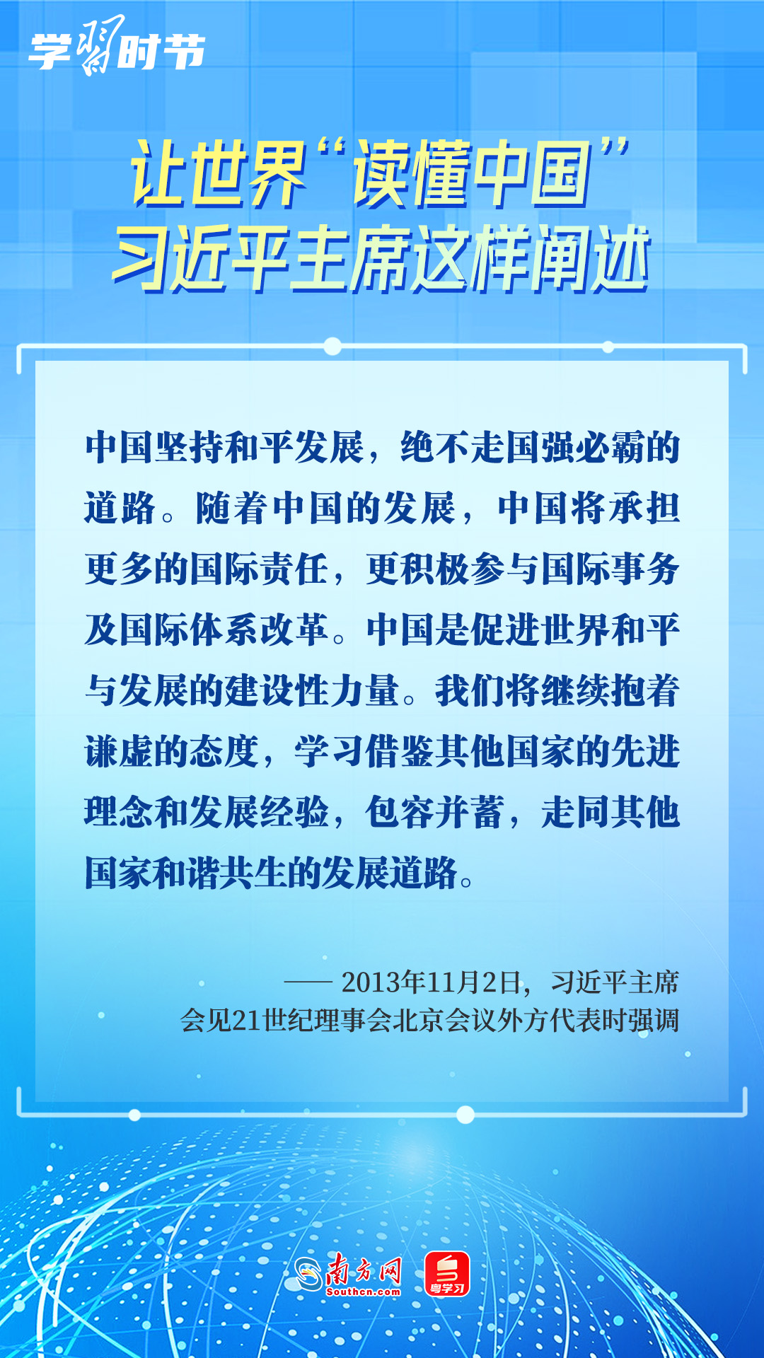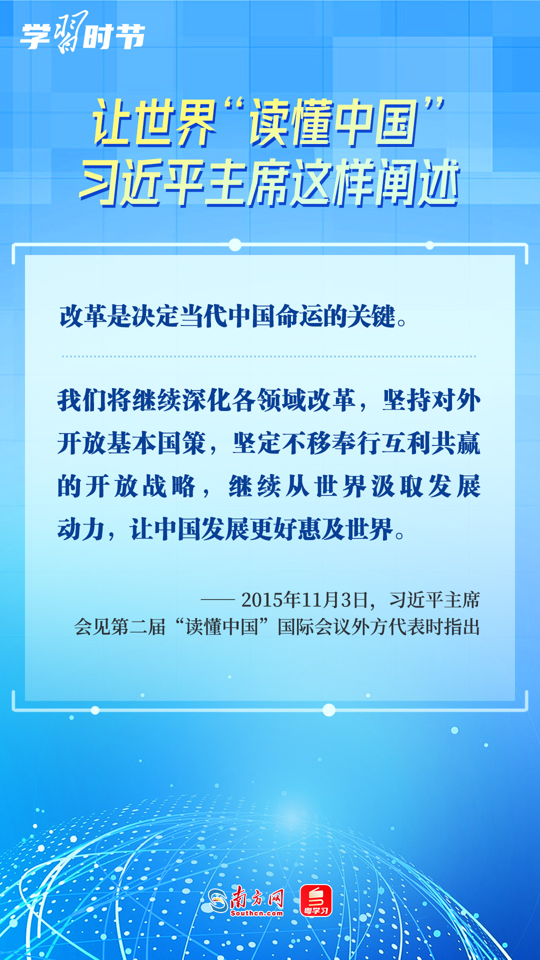 習(xí)近平主席高度重視“讀懂中國”國際會議,多次會見與會代表、向會議致辭或致賀信,闡述中國的發(fā)展道路、改革開放、對外政策等,讓我們一同學(xué)習(xí)。