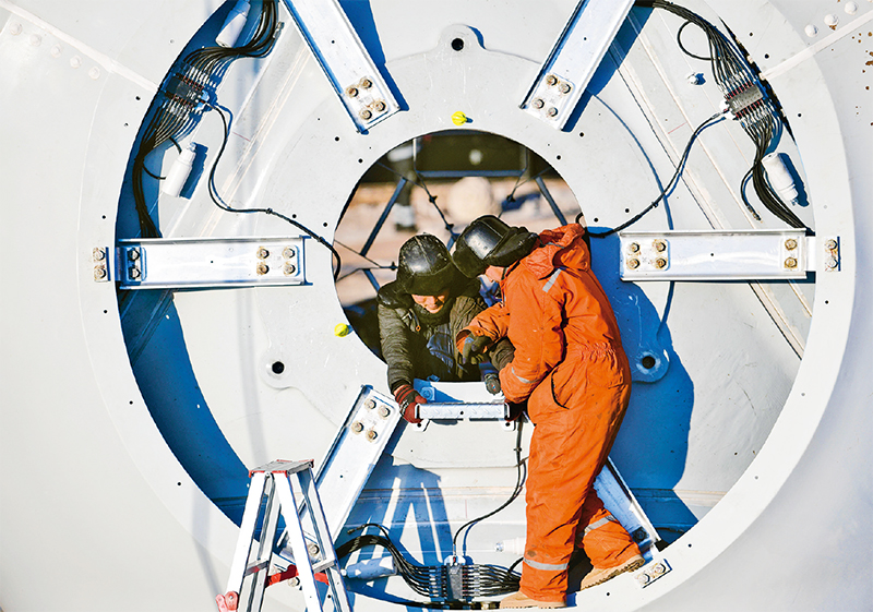 河北承德豐寧風(fēng)光氫儲100萬千瓦風(fēng)光項(xiàng)目是國家“十四五”規(guī)劃的大型清潔能源基地——冀北清潔能源基地的標(biāo)志性工程。項(xiàng)目建成后,預(yù)計(jì)每年可生產(chǎn)綠電18億千瓦時(shí),減少二氧化碳排放約140萬噸。圖為2024年1月12日,該項(xiàng)目的工人在安裝風(fēng)機(jī)輪轂配件。 新華社發(fā) 王立群/攝