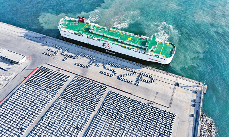 2023年,我國電動載人汽車、鋰離子蓄電池和太陽能電池為代表的“新三樣”產(chǎn)品合計(jì)出口首次突破萬億元大關(guān),展現(xiàn)了中國制造的新優(yōu)勢。圖為2024年1月14日,比亞迪“開拓者1號”(“BYD EXPLORER NO.1”)滾裝船抵達(dá)深圳港小漠國際物流港。 新華社發(fā)