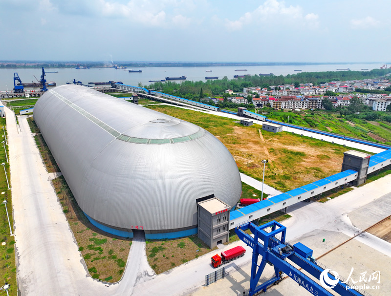 位于九江柴桑區(qū)的九江港赤湖作業(yè)區(qū)公用碼頭的“膠囊”倉(cāng)庫(kù),是全國(guó)第二個(gè)、江西首個(gè)新型智慧散貨碼頭。人民網(wǎng) 朱海鵬攝