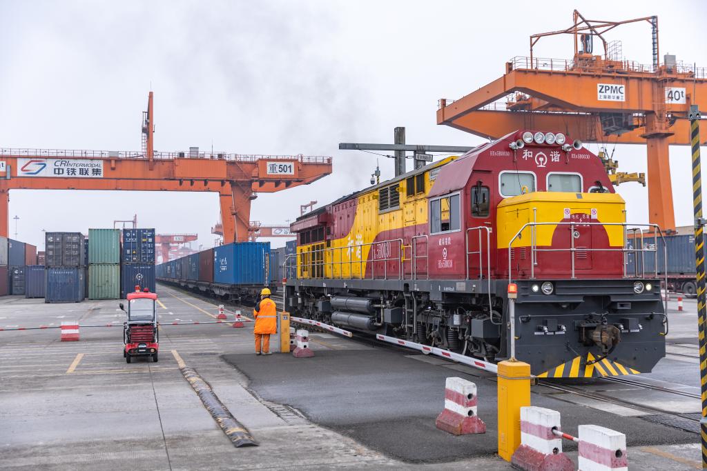 ??3月7日,一列滿載機械設(shè)備、整車及零部件等貨物的中歐班列在重慶團結(jié)村中心站等候發(fā)車。新華社記者 黃偉 攝