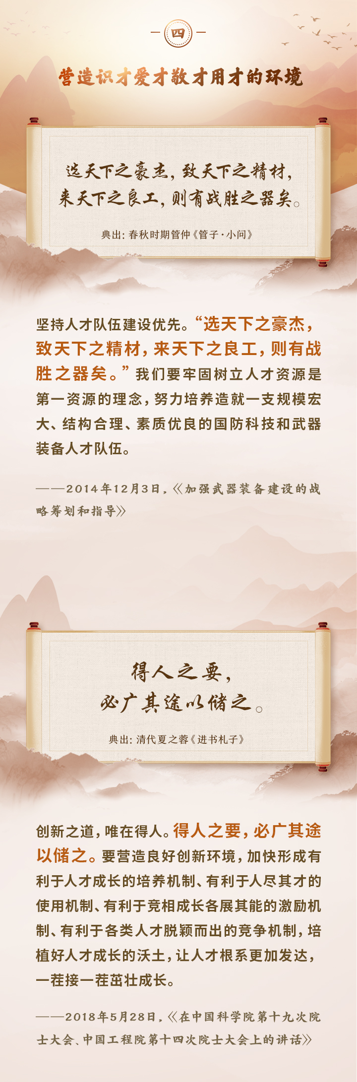 編者按:培養(yǎng)造就大批德才兼?zhèn)涞母咚刭|(zhì)人才,是國家和民族長遠發(fā)展大計。黨的十八大以來,習近平總書記圍繞人才工作發(fā)表一系列重要論述,立意高遠,內(nèi)涵豐富,思想深刻,深刻回答了為什么建設(shè)人才強國、什么是人才強國、怎樣建設(shè)人才強國的重大理論和實踐問題。在這些重要論述中,總書記精妙運用古代典籍、經(jīng)典名句,以古喻今、啟迪思想、激蕩精神,讓我們一起來學習!