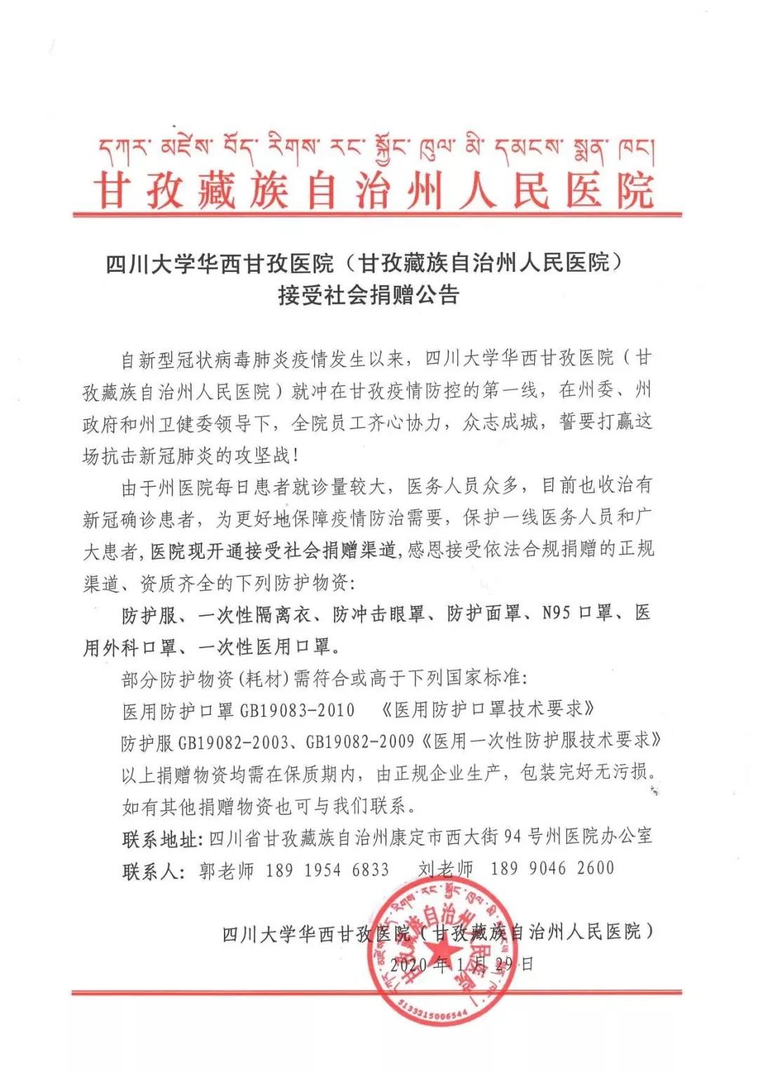 為積極應(yīng)對(duì)新型冠狀病毒感染肺炎疫情,甘孜州紅十字會(huì)正全力參與疫情防控工作,全力配合做好社會(huì)各界愛(ài)心捐贈(zèng)接收,現(xiàn)將有關(guān)事宜公告如下: