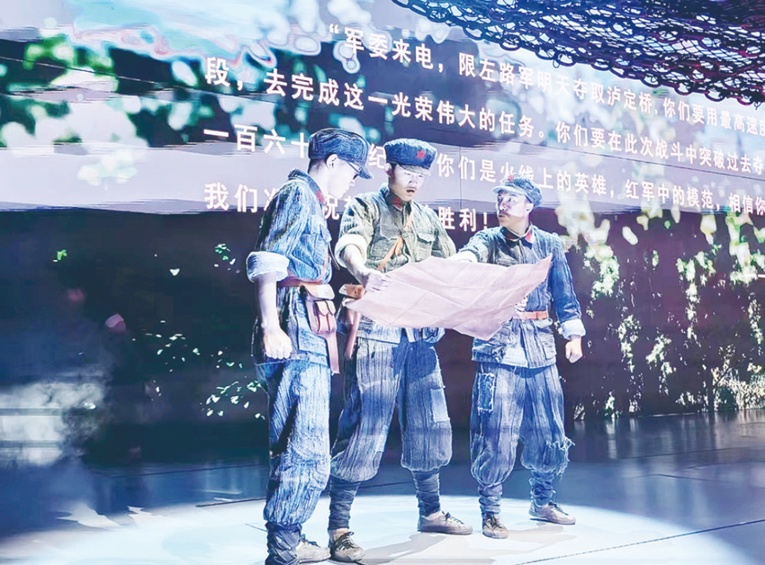 “同志們,跟我前進!”“以最快速度趕到瀘定橋,才是我們的首要任務(wù)……”舞臺大幕開啟,影像結(jié)合舞美形成一組巨型浮雕,在燈光的映照下,紅軍戰(zhàn)士堅毅的臉龐漸漸浮現(xiàn),他們佇立在瀘定橋旁,目光如炬。燈滅,炮火聲從遠處傳來……這是大型原創(chuàng)舞臺劇《飛奪瀘定橋》中的場景,每天上午10時30分和下午3時,該劇在瀘定縣紅軍飛奪瀘定橋紀念碑公園內(nèi)的紅軍劇場上演。偉大的長征是中國共產(chǎn)黨和紅軍譜寫的壯麗史詩,是中華民族偉大復(fù)興歷史進程中的巍峨豐碑。舞臺劇《飛奪瀘定橋》聚焦宏大歷史中的典型事件,以紅軍長征途中飛奪瀘定橋戰(zhàn)役為背景,以一個紅軍小號手的視角,生動講述紅四團晝夜奔襲240里,22名突擊隊員在槍林彈雨中踩著13根鐵索成功奪下瀘定橋的故事,藝術(shù)展現(xiàn)紅軍的堅定革命信念和必勝信心,讓觀眾在感動中重溫偉大長征精神。