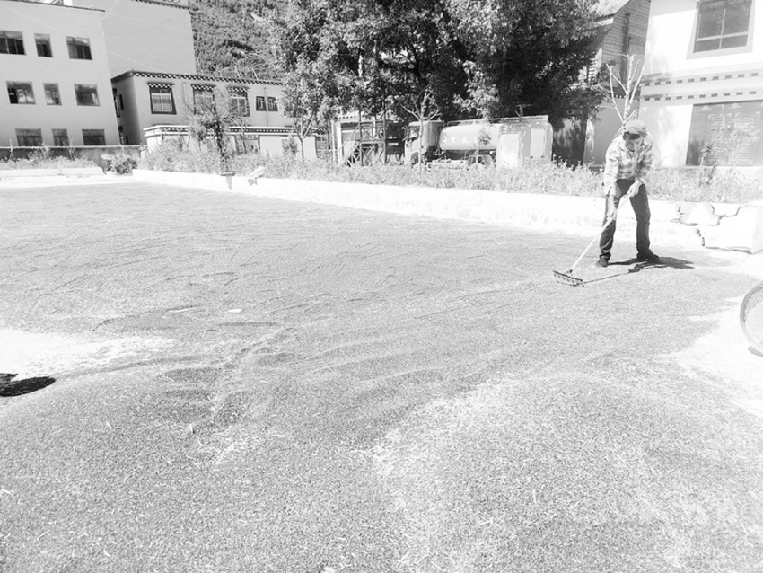 河坡鎮(zhèn)博嘎合作社村民正忙著晾曬菜籽。