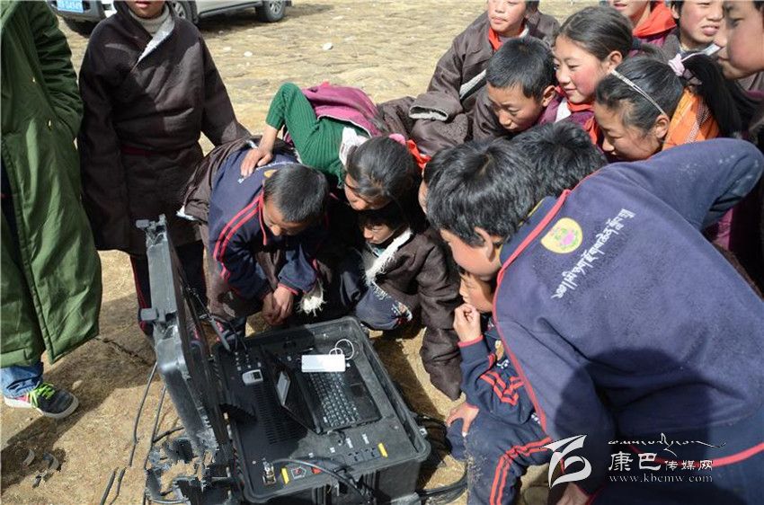 孩子們圍坐在國(guó)家電網(wǎng)四川電力公司前的便攜式衛(wèi)星通訊設(shè)備,與另一方連線的人進(jìn)行視頻聊天。