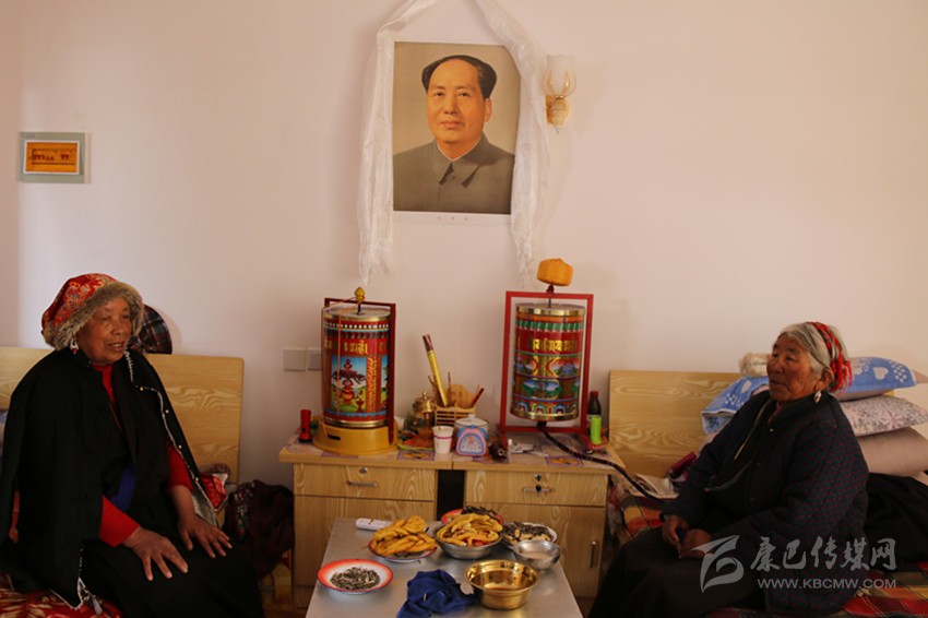 從餐廳出來,記者走進了一間15平方米左右的宿舍。兩位老人正坐在各自的木床上看電視,墻上掛著的液晶電視是連著機頂盒的。兩床之間,放著藏桌和床頭柜,藏桌上有瓜子、花生、酥油果子、牛肉等食品,亞瑪翁青老人熱情地說:“因為正在過藏歷新年,這些都是福利院為我們備的年貨,你也嘗嘗!”。房間里最引人注目的便是掛在床頭柜上方的系著哈達的毛主席畫像,兩位老人指著毛主席畫像動情地說:“毛主席、共產黨是我們的恩人,看著他的畫像我們安心?!贝送?,房間里還有衣柜、配有馬桶的獨立廁所和盥洗臺,毛巾、漱口盅、掃把、拖把都整齊地放在對應位置。亞瑪翁青笑著說:“我們住的房間都趕得上縣城里的賓館了?!?/span>