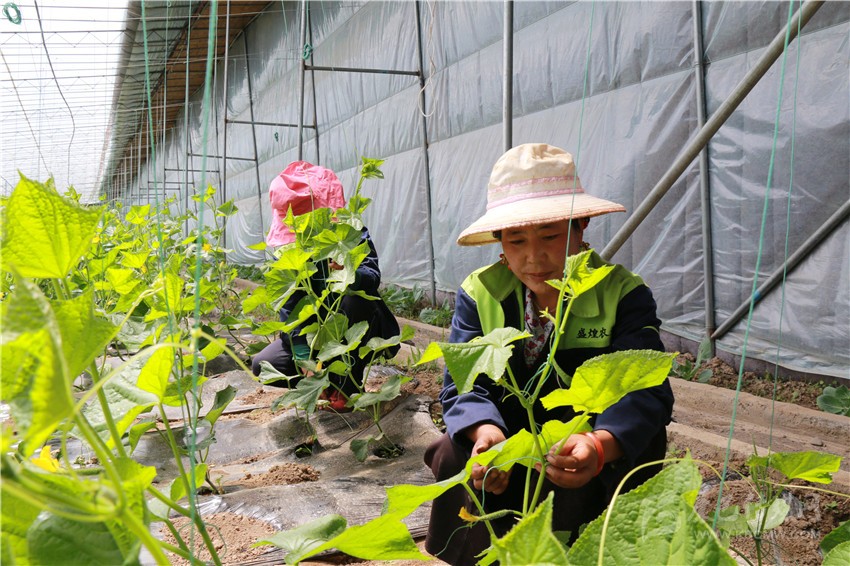 村民在蔬菜大棚里工作。