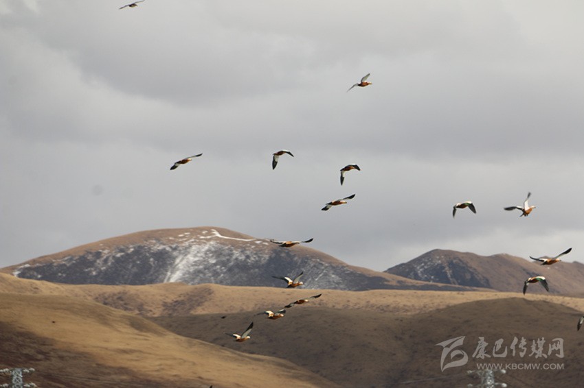 當岸邊的相機瞄準了赤麻鴨時,它們儼然變成了色達的明星,時而成群展翅,劃過冰面,飛向高空,時而交頸嬉戲,溫馨和睦,在藍天、白云和雪峰的襯托下,優(yōu)雅的舞姿盡展了色達山川的廣闊壯美。