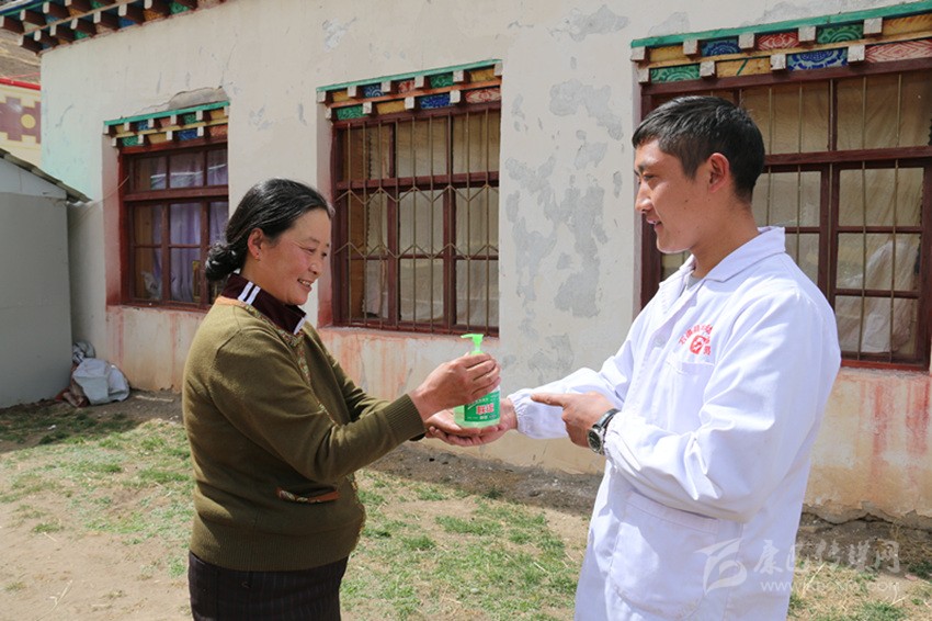 石渠縣溫波鄉(xiāng)衛(wèi)生院在村民白洛家送洗手液。
