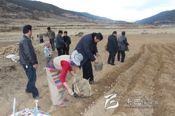 在格中村的田間地頭,到處是一片忙碌的春播景象。雷建平走進(jìn)斯朗卓瑪?shù)奶镩g,在農(nóng)業(yè)技術(shù)人員的指導(dǎo)下,從選種開始學(xué)起,病害的種丟掉、大的切成幾瓣,撒點底肥,均勻丟種,把蓋種的土弄成一個梯形的壟。雷建平一邊勞動,一邊和斯朗卓瑪攀談,去年土豆收成怎樣?有沒有增加收入?今年春耕生產(chǎn)有哪些實際困難?雷建平又接著向她推薦用地膜種土豆的好處,蓋不蓋膜大不一樣,1畝要多收500-1000公斤,加上上市早,價格也要貴一些,可以到臨近的甲洼鄉(xiāng)江達(dá)村去學(xué)習(xí)經(jīng)驗。