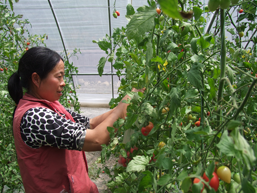 “盛煌公司來(lái)這里開展蔬菜大棚建設(shè)以后,每畝每年按照1500元的標(biāo)準(zhǔn)支付了村民的土地流轉(zhuǎn)租金。我是外地嫁到這里來(lái)的,沒(méi)有土地,他們雇傭我來(lái)務(wù)工,每個(gè)月按照1800元支付我的工資,每個(gè)月還可以休息兩天。”正在大棚里摘水果番茄的村民陳國(guó)蓉知足地說(shuō)。