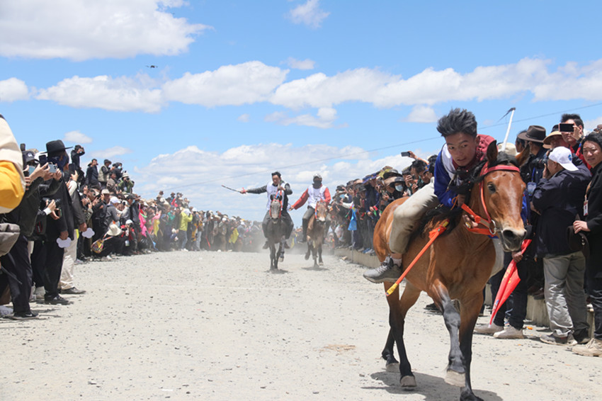 雪山潔白、青稞碧綠,雪白的貢嘎海棠搖曳在枝頭,目之所及,皆是風(fēng)景。騎手騎著自己心愛的馬兒,一個(gè)個(gè)英姿颯爽、神采飛揚(yáng)。隨著發(fā)令員的口號(hào)響起,駿馬像離弦的箭一樣飛奔出去,騎手們?nèi)笺T足了勁,勢(shì)必要在比賽中拔得頭籌。賽道上的駿馬你追我趕,賽道邊慕名前來的游客和周邊村民吶喊加油,跑出了甘孜兒女奮發(fā)向上、積極進(jìn)取的精神風(fēng)貌。