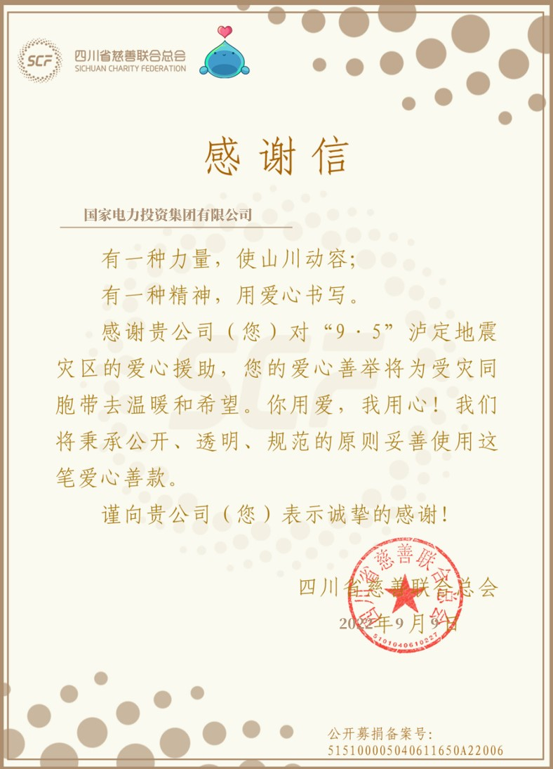2022年9月5日12時52分,瀘定6.8級地震發(fā)生后,國家電投集團立刻向災(zāi)區(qū)捐款1000萬元,全力支援災(zāi)區(qū)救助和災(zāi)后重建,幫助災(zāi)區(qū)人民共渡難關(guān)。面對災(zāi)情,國家電投甘孜興川公司迅速啟動地震應(yīng)急響應(yīng),做好人員、設(shè)備詳細(xì)排查,防范塌方、泥石流等次生災(zāi)害,保持安全生產(chǎn)穩(wěn)定,千方百計保安全、保供電,充分發(fā)揮央企能源供應(yīng)“穩(wěn)定器”和“壓艙石”作用,助力災(zāi)區(qū)盡快恢復(fù)生產(chǎn)生活秩序。統(tǒng)籌調(diào)度各方力量,克服疫情和余震影響,緊急采購災(zāi)區(qū)急需的發(fā)電機、電筒等設(shè)備第一時間送達(dá)災(zāi)區(qū),支援應(yīng)急。在得知瀘定縣得妥鎮(zhèn)電力系統(tǒng)受災(zāi)嚴(yán)重急需救援力量后,公司迅速成立抗震救災(zāi)保供黨員先鋒隊,從正在緊張施工的興川實證光伏電站抽調(diào)精銳力量26人奔襲700公里,抵達(dá)瀘定縣得妥鎮(zhèn),緊急馳援地方搶險救災(zāi)工作,拆除100多戶危房電源,恢復(fù)2個行政村460戶村民安全用電,贏得當(dāng)?shù)卣蜕鐣鹘缫恢潞迷u。