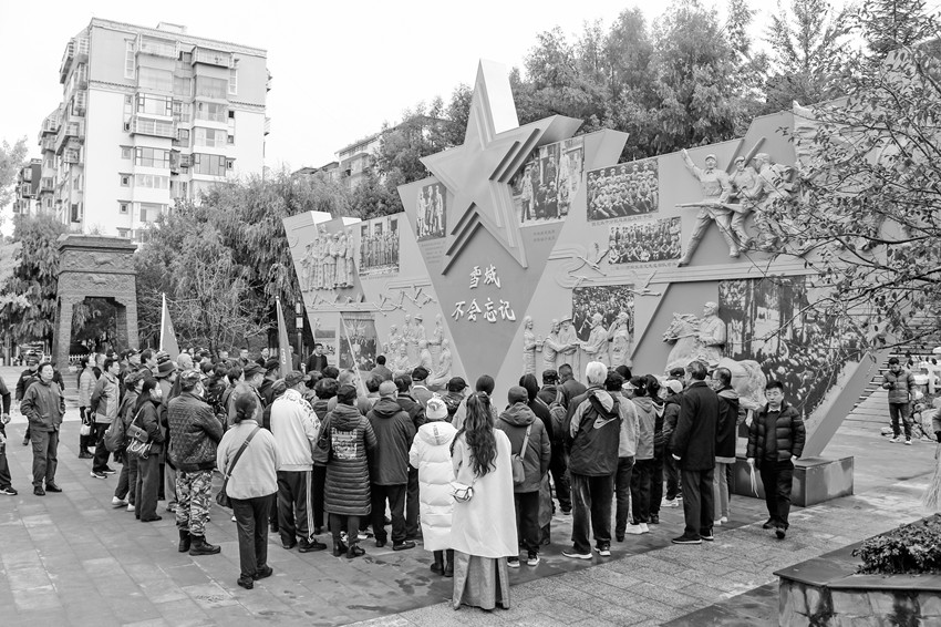 圖為革命后代參觀瞻仰“雪域不會忘記——康定和平解放暨南下干部入康紀(jì)念浮雕墻”。