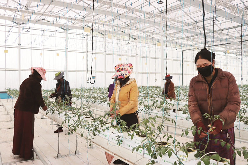 理塘縣甲洼鎮(zhèn)瑪吉阿米花園農(nóng)莊智慧農(nóng)業(yè)無土栽培館內(nèi),工人正忙著給番茄苗綁蔓、整枝、打杈等。