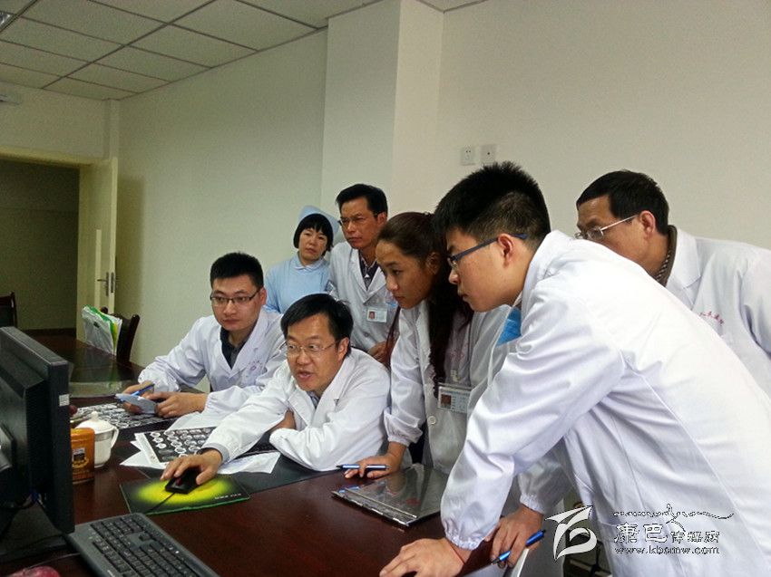 ●黃林教授(右二)指導(dǎo)閱片。