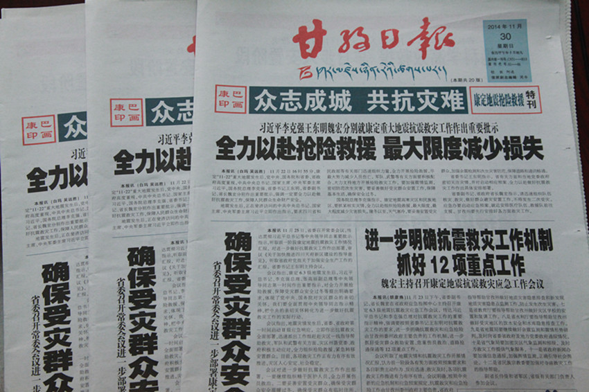 又訊 此外,自康定地震發(fā)生以來,本報藏漢文報廣大編采人員發(fā)揚(yáng)連續(xù)作戰(zhàn)的精神,已經(jīng)連續(xù)9天不分白天黑夜地工作,保證了一線有記者的身影,后方編輯及時發(fā)聲,截止30日,本報藏漢文報已經(jīng)出版13期《眾志成城 共抗災(zāi)難》??鸵黄谔乜灿?2個版面;本報《康巴傳媒網(wǎng)》自開辦網(wǎng)站以來,首次實(shí)現(xiàn)了網(wǎng)站信息即時更新、滾動發(fā)布,網(wǎng)站日上稿量超過100條,日點(diǎn)擊量均超過10萬人次;本報微信平臺則采用短平快的方式,第一時間發(fā)布最新資訊,引導(dǎo)公眾情緒,傳播黨委政府的聲音,微信日點(diǎn)擊和轉(zhuǎn)發(fā)量超過2萬人次;除此之外,本報承辦的手機(jī)報也發(fā)揮了巨大的作用。
