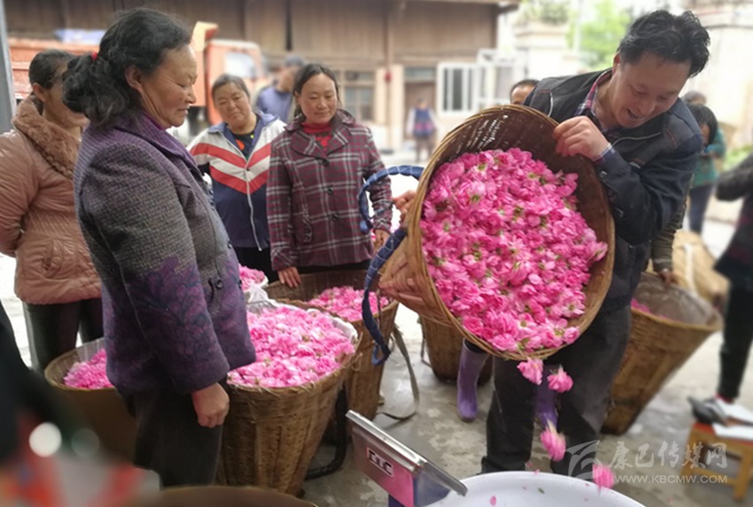 16日上午,小雨停了下來,趕在太陽出來之前采摘的玫瑰花出油率好,是采摘的黃金時間。在燕子溝鎮(zhèn)新龍門子村生產加工點,周邊農戶將采摘的粉色玫瑰花瓣過秤,逐筐倒進特定的堆放地點,農戶們也收到了應得的勞務收入,空氣中彌漫著一股玫瑰花特有的芳香和浪漫,也充滿了當地百姓幸福和甜蜜的味道。