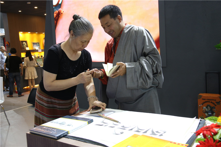 而在同一地點(diǎn)的另一側(cè),省級(jí)藏文書法傳承人巴松鄧珠的藏文書法也吸引著眾多愛好書法市民前來(lái)觀賞,還有的與他合影?!爸笇?dǎo)過(guò)我的書法家非常多,他們不僅給了我許多寶貴的意見,更重要的是給了我信心和動(dòng)力,讓我堅(jiān)持寫書法,并成為康體藏文書法的傳承人?!卑退舌囍檎f(shuō),這次能夠得到州委、州政府搭建的平臺(tái),我會(huì)珍惜好這次難得的機(jī)遇,把作品展示好、宣傳好,讓全國(guó)各地的人們更多地了解我州民族文化。
