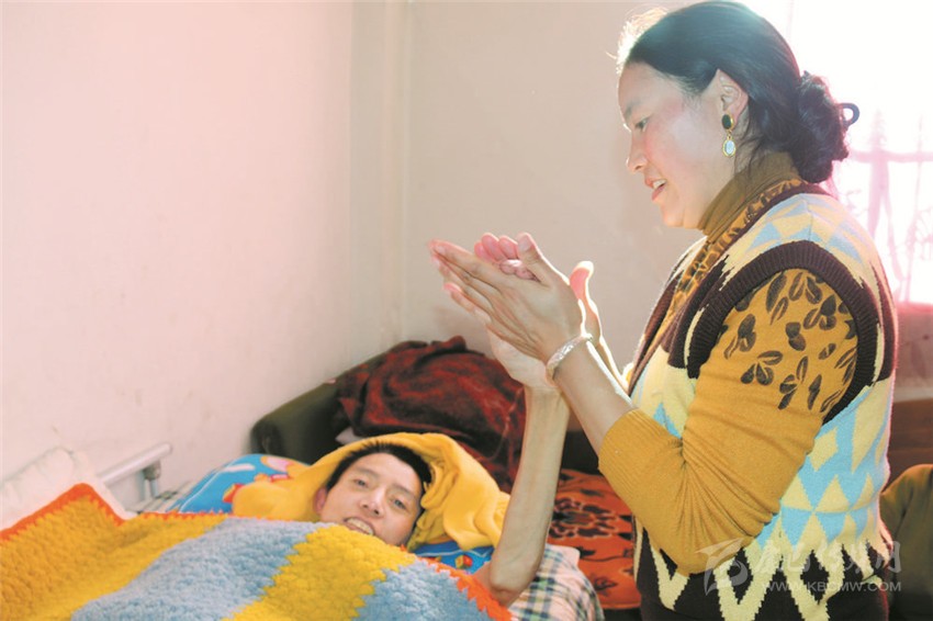 因?yàn)楦q的意外事故,家里沒有了經(jīng)濟(jì)來源。巨大的經(jīng)濟(jì)壓力,讓白措喘不過氣來。但她沒有向命運(yùn)低頭,撫育3個(gè)孩子,就近務(wù)工掙錢補(bǔ)貼家用。同時(shí),利用工作間隙回家,照顧丈夫吃飯,給他翻身,換洗沾滿屎尿的墊布……因?yàn)閾?dān)心丈夫久臥生褥瘡和肌肉萎縮,白措每隔3小時(shí)就要給丈夫翻身,還自學(xué)了一套按摩手法替根絨全身按摩。在她的精心照料下,根絨身體慢慢得到了康復(fù)。