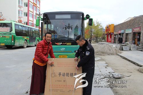 汪都老人的朋友幫助領輪椅。