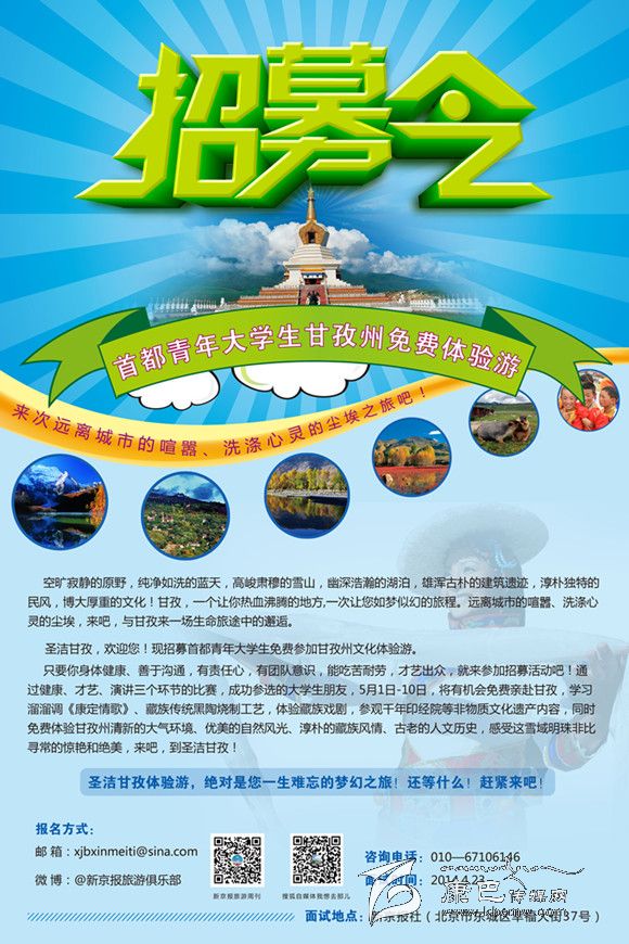 本網(wǎng)訊(本網(wǎng)記者)為進一步宣傳展示甘孜州的康巴文化積淀與旅游特色,州委、州政府將舉辦“圣潔甘孜,走進北京”的文化旅游周宣傳活動,在宣傳周前期推出了一個亮點活動,就是面向首都各高校公開招募一批青年大學(xué)生赴甘孜州體驗生活,讓他們走出都市,感受生態(tài)甘孜的藍天白云,感悟和諧甘孜的幸福文明,以他們的親身經(jīng)歷為樣本案例,見證新甘孜的獨特魅力。