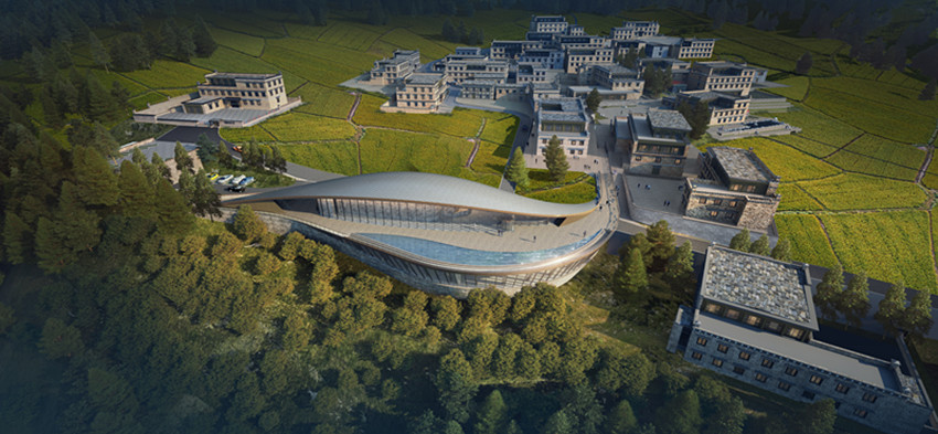 “這個香巴拉文化博物館模擬了‘吉祥八寶’之一的白海螺形態(tài),朝村莊一側(cè)是從地面延伸而成的體量,共分3層,總高度17.4米,總建筑面積2994.6平方米?!敝薪ò司治髂辖ㄔO(shè)工程有限公司項(xiàng)目總工喬興國向記者介紹,香巴拉文化博物館朝村莊一側(cè)是從地面延伸而成的體量,自然地融于山林中,朝山谷一側(cè)通過水面反射回應(yīng)壯麗雪山。