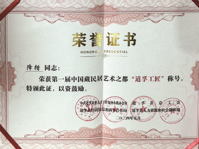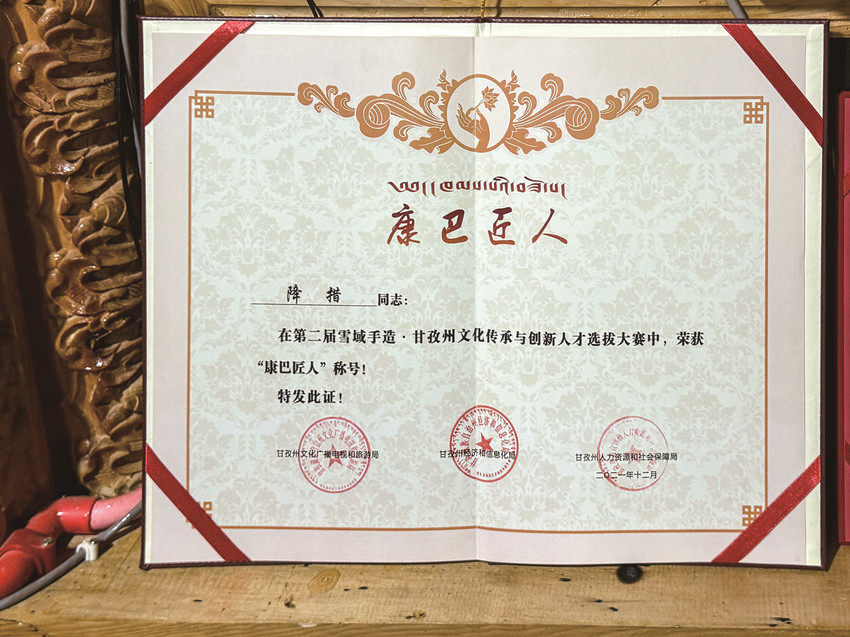 道孚縣孔色鄉(xiāng)瓦依村的降措從小酷愛藏紙文化,2008年,在降初扎巴老師處系統(tǒng)的學(xué)習(xí)了造紙工藝,2021年,獲得了州級非遺傳承人榮譽(yù)稱號,同年12月,在康巴文化大賽中獲得了“康巴匠人”榮譽(yù)稱號。