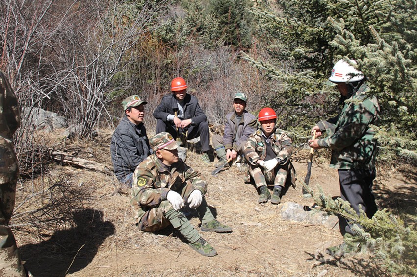 代敬濤和工友們在巡山途中休息。