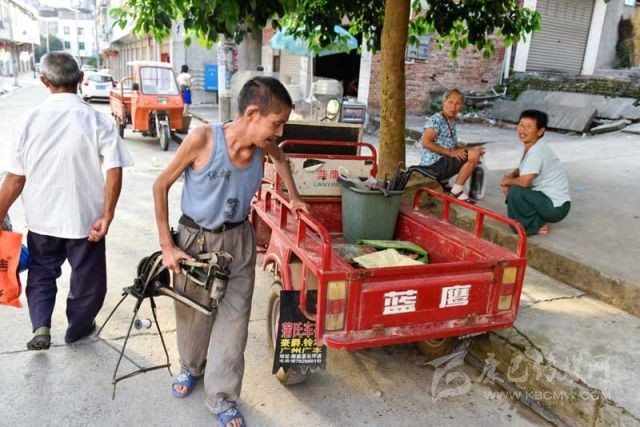 8月15日清晨不到7點(diǎn),在四川省南部縣中心鄉(xiāng)漏米巖村,周強(qiáng)善正將補(bǔ)鞋工具搬上機(jī)動(dòng)三輪車,準(zhǔn)備從家出發(fā)去鄰近的長坪鎮(zhèn)集市趕場(chǎng)。攝影 張可凡