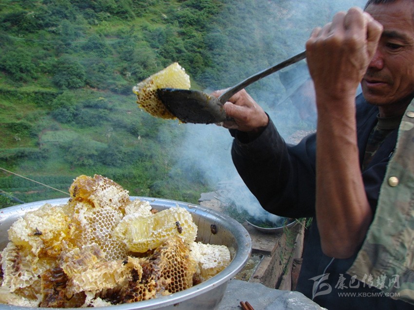 這時(shí)候,一位城里人開著車來到他家里,前來購買蜂蜜。蘭友才提著火爐,在里面撒上柏樹枝椏,打開蜂箱蓋子后,將煙霧吹進(jìn)蜂箱里。不一會(huì)兒,蜜蜂們紛紛飛出巢穴,在幾十米開外不停的飛翔、徘徊,只留下滿箱雪白的蜂蠟一排排整齊的豎立在那里。蘭友才拿出一把刀,輕輕地在蜂蠟上割取,并迅速將浸滿琥珀色糖液的蜂蠟放進(jìn)瓷盆里。蘭友才告訴我,蜂蠟的上半部分為蜂蜜,下半部分是蜂蛹的巢穴,因此只割取上半部分。