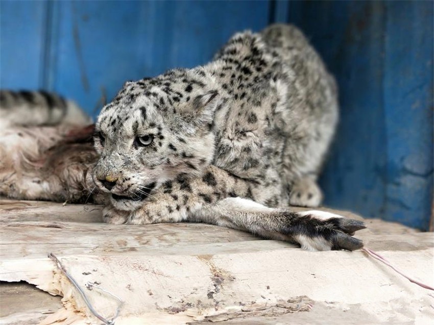 不放心受傷雪豹的隊員們隨即將發(fā)現(xiàn)的情況按屬地管理原則上報了該鄉(xiāng)黨委政府,聯(lián)系了行業(yè)主管部門林草局,并上報縣委縣政府,縣委政府主要領(lǐng)導(dǎo)高度重視要求鄉(xiāng)黨委政府和林草局賡即組織人員再到現(xiàn)場附近搜尋受傷雪豹看是否需要救治。當(dāng)一行人再次來到現(xiàn)場,發(fā)現(xiàn)受傷的雪豹可能由于舍不得“獵物”去而復(fù)返正趴在巖羊旁,也可能由于傷情見人前來并未離去。大家在簡單商議后,決定先由獸醫(yī)為雪豹現(xiàn)場查驗傷勢。為防止雪豹傷人,在大家的配合下做出必要的防護措施后,開始為雪豹查驗傷勢,經(jīng)查驗發(fā)現(xiàn)該雪豹左前肢和左后肢均被咬傷,其中左前肢受貫穿性咬傷,傷勢較重,造成其無法行走,隨即大家決定將雪豹帶回救治。