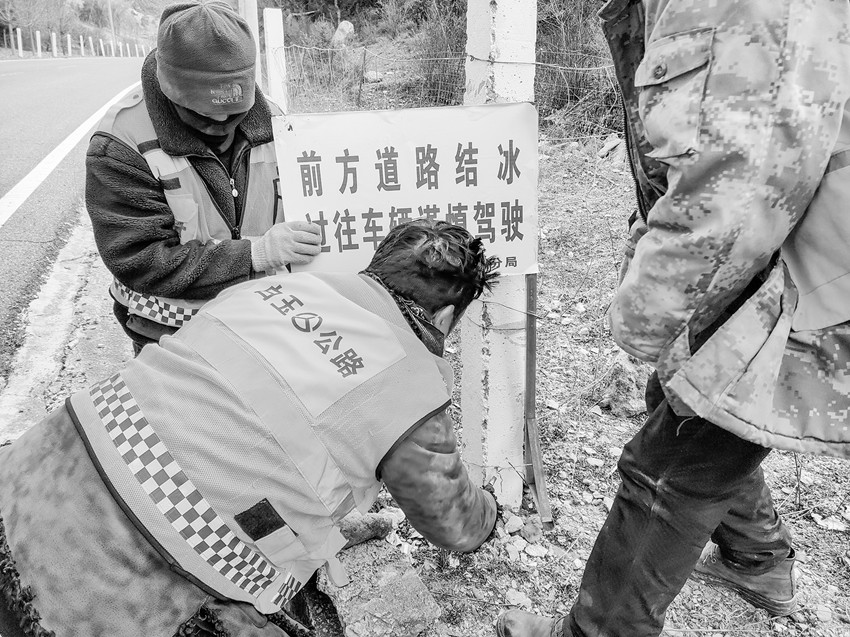 冬季氣溫下降,在夜晚形成結(jié)冰現(xiàn)象,易造成汽車打滑,難以控制,對過往車輛安全造成極大威脅。白玉公路分局出動(dòng)人員 450 人、 車輛72輛次,對管養(yǎng)轄區(qū)道路全線進(jìn)行警示牌的安裝。同時(shí),對有暗冰、陰山積雪等路段及時(shí)拋灑防滑沙和融雪劑,確保道路行駛安全。