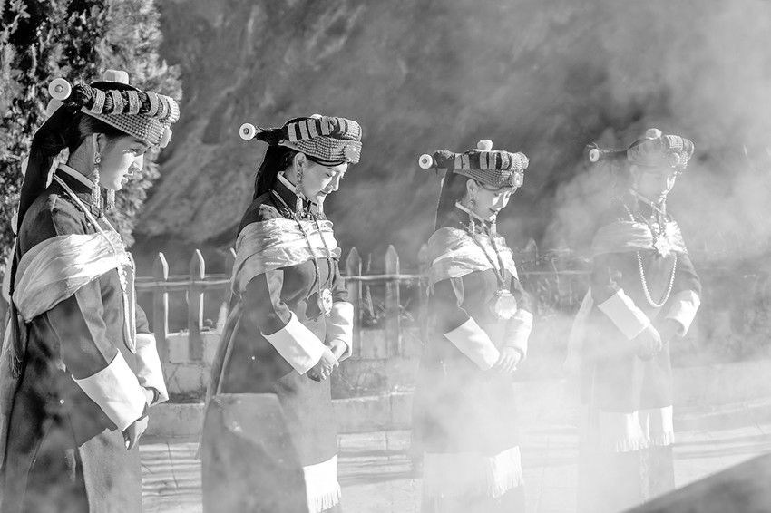 嘉賓體驗(yàn)團(tuán)首先來(lái)到位于甲居藏寨景區(qū)里的“點(diǎn)石·寶生居”特色民宿,只見(jiàn)一位年邁的嘉絨長(zhǎng)者正主持“成人禮”儀式,桑煙裊裊,為即將成年的少女送去了誠(chéng)摯祝福。完成儀式的嘉絨姑娘們隨長(zhǎng)者一同跳起了非遺傳統(tǒng)舞蹈孔雀鍋莊,千年前東女古國(guó)的風(fēng)采得以重現(xiàn)。