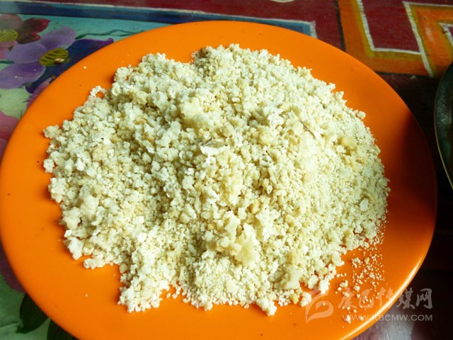 奶渣是奶提煉酥油后剩下的物質(zhì),經(jīng)燒煮,水份蒸發(fā)后,剩下是奶渣,奶渣可以做成奶餅、奶塊。在煮牛奶過程中,還可揭起奶皮,藏語叫“比瑪”。奶皮就像豆腐皮一樣,好吃又富有營養(yǎng)。奶品是藏族的重要食品,家居或外出,人們都帶上它。在零食品種不多的藏區(qū),大人們常把奶渣給小孩當(dāng)零食。麻森在盤子里放上適量的糌粑、酥油、碎奶渣及碎紅糖,攪混揉合,盛入一方形小木盒內(nèi),用手塞滿、壓實(shí),即可制成麻森方形糕,其味香甜可口。
